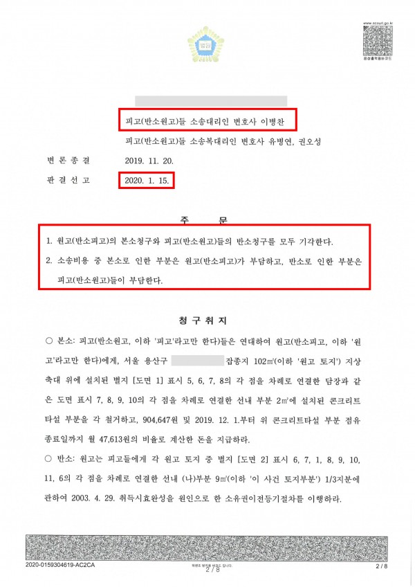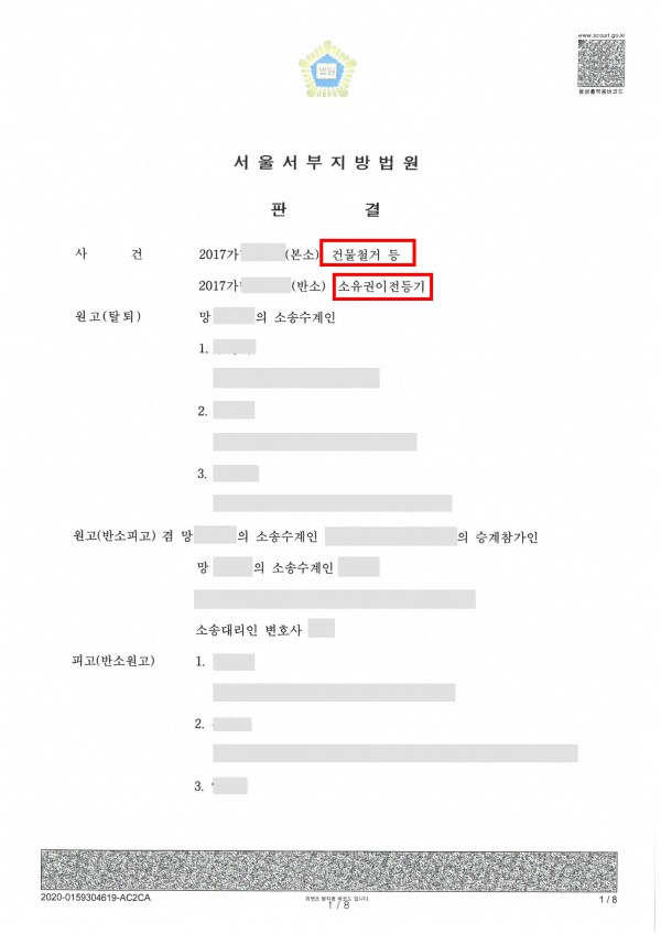 원고(상대방) 청구 기각, 건물철거 등(민사)
