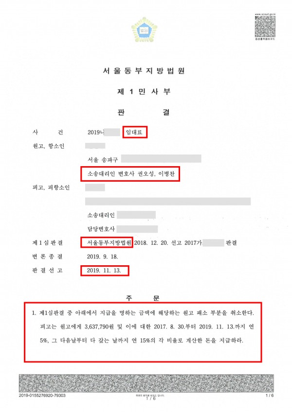 [민사] 원고(의뢰인) 항소 인용 / 임대료
