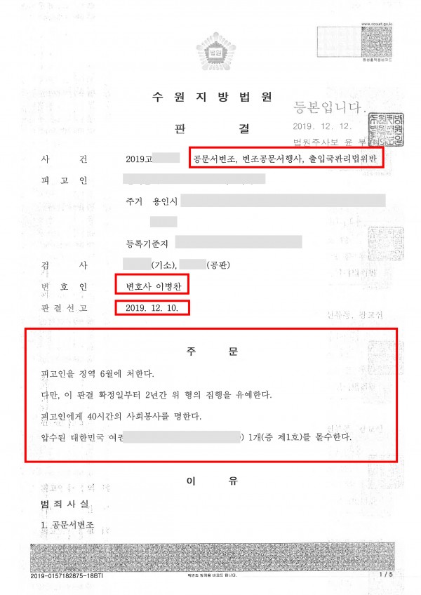 [형사] 집행유예 (구형 : 징역 2년) / 공문서변조,변조공무서행사, 출입국관리법위반 페이지 정보 관련링크 본문 집행유예 (구형 : 징역 2년), 공문서변조,변조공무서행사, 출입국관리법위반(형사) 이전글 다음글 목록