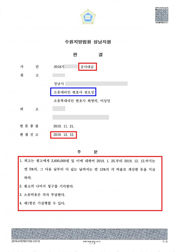 원고(의뢰인) 청구 인용, 공사대금청구(민사)