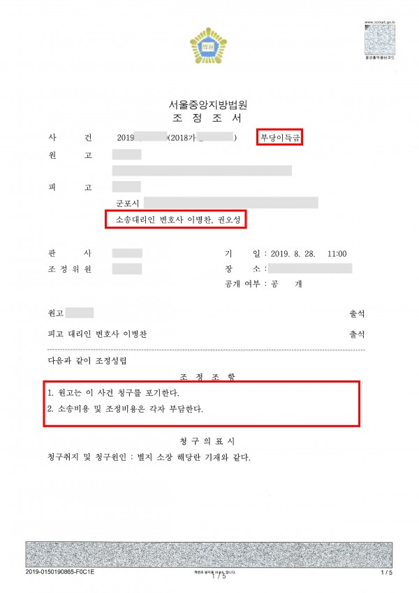 원고(상대방) 청구 기각, 부당이득반환청구(민사) 페이지 정보 관련링크 본문 [의뢰인의 혐의 및 사실관계] 보이스피싱 피해자가 대포통장제공자로 연루된 의뢰인을 상대로 부당이득 반환청구를 한 사안이었습니다. [본 사건의 특징] 해당 사건은 보이스피싱 민사 조정을 통해 상대방이 소송을 질 수 밖에 없는 이유를 설명하고 소송을 포기한다면 소송비용을 청구하지 않기로 하여 조정 성립에 성공한 사건이었습니다. 이전글 다음글 목록