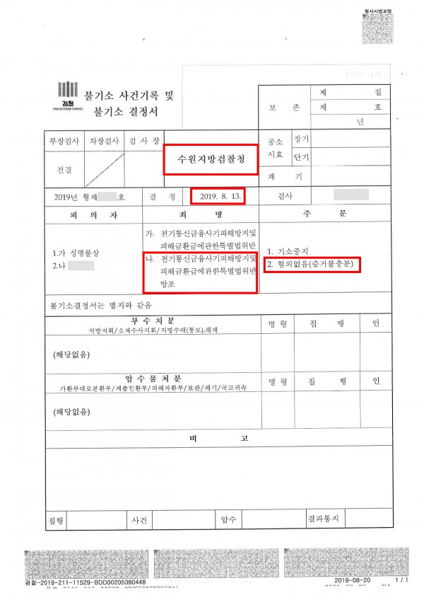 [형사] 혐의없음 / 사기방조 (전기통신금융사기피해자방지및피해금환급에관한특별법위반방조로 입건되었으나, 실질은 사기방조)
