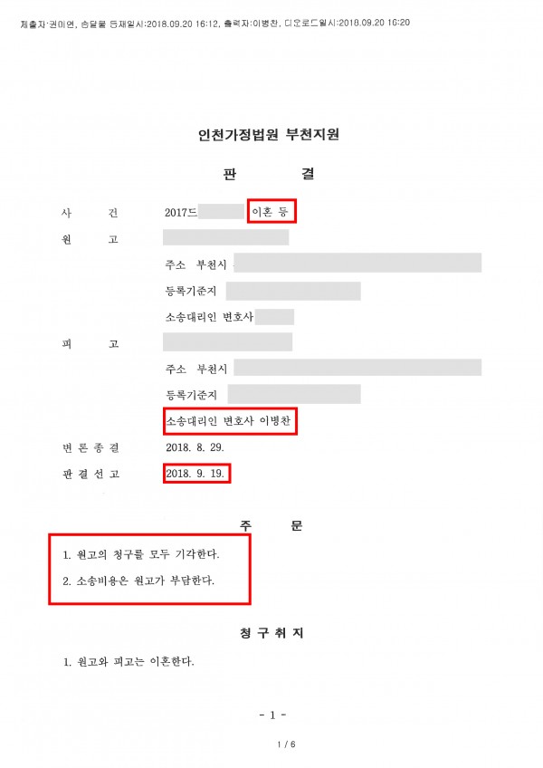 [가사] 원고(상대방) 청구 기각(상대의 이혼 청구 기각) / 이혼 및 재산분할, 위자료 청구 페이지 정보 관련링크 본문 [가사]이혼 및 재산분할, 위자료 청구 기각 성공 사례 이전글 다음글 목록