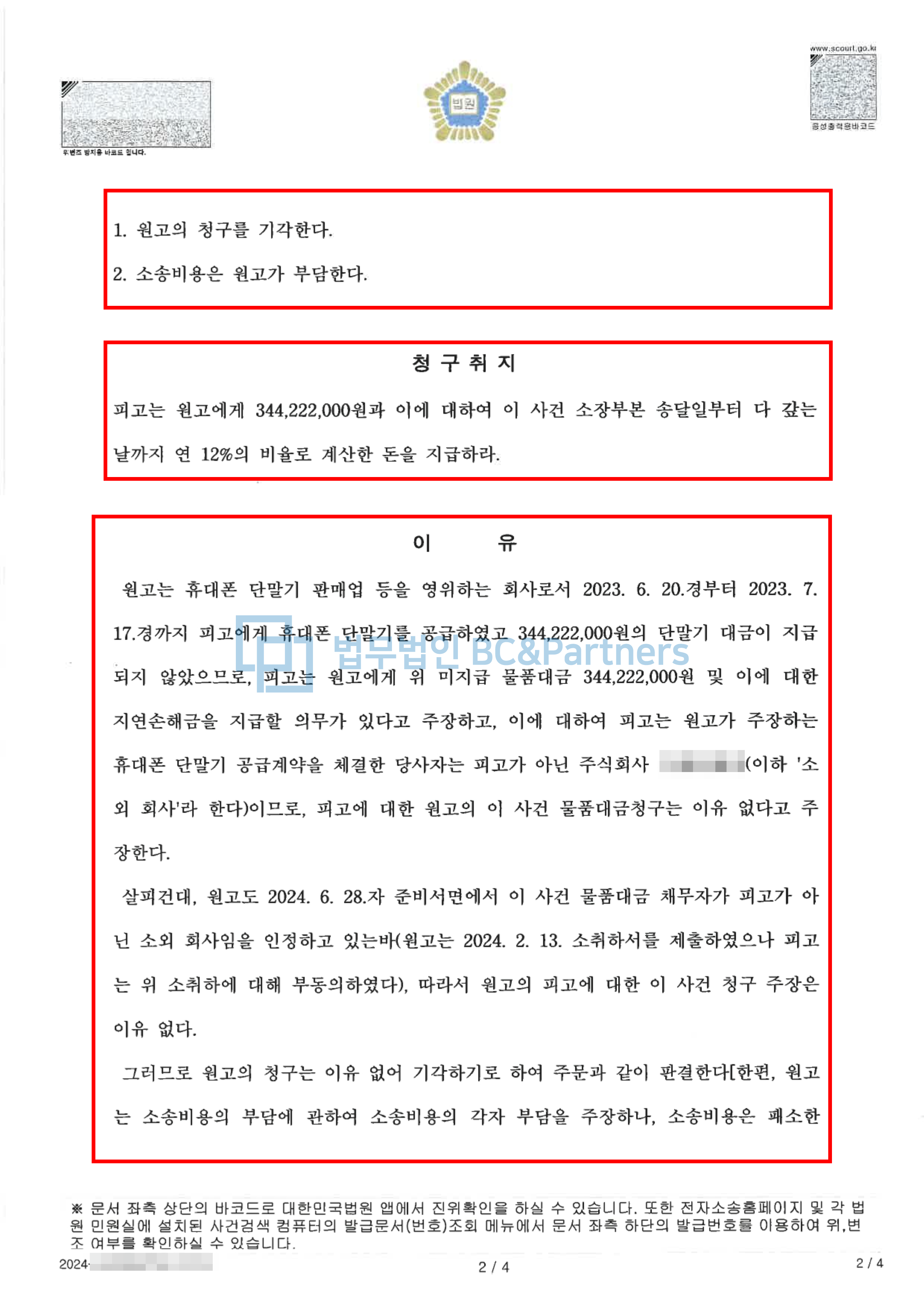 "상대방은 법인 상대로 물품거래를 하였지만 법인의 자력이 좋지 않다고 판단하자 대표자 개인을 상대로 세금계산서를 발행하는 등 개인을 상대로 소송을 제기할 준비 작업을 하고 바로 개인을 상대로 소송을 제기하였지만 결국 청구금액 전액을 성공적으로 기각시킨 사안"