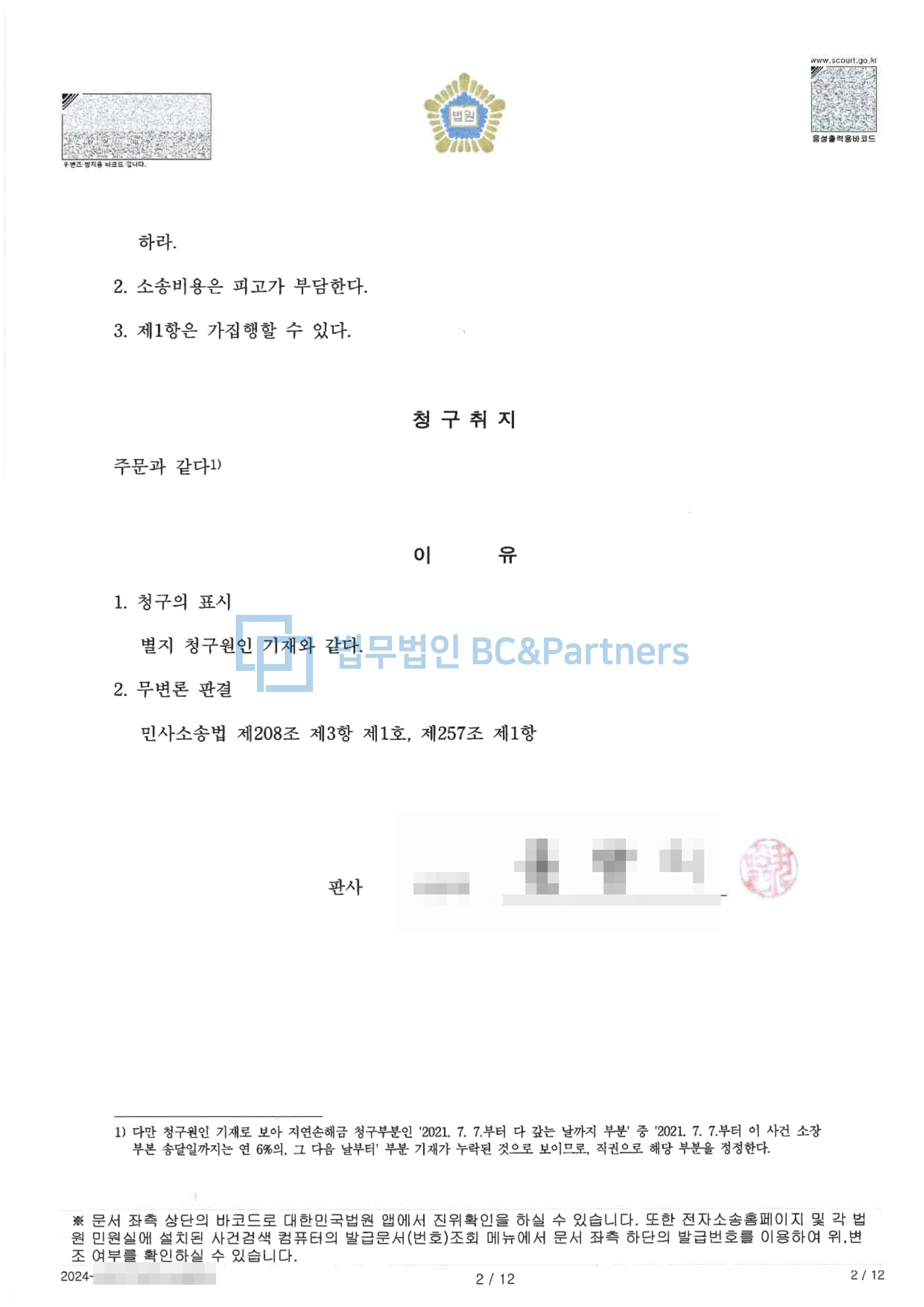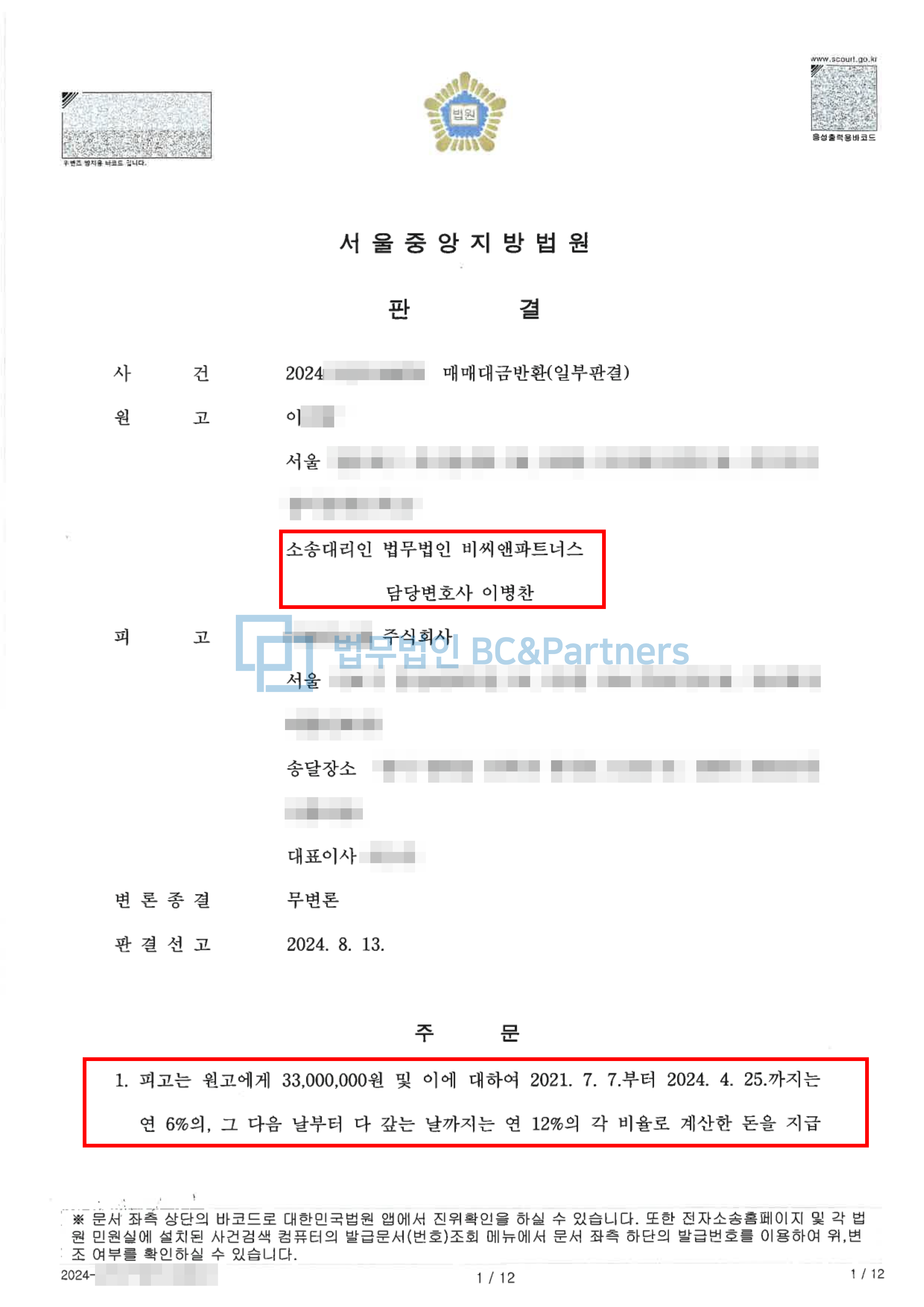 전부승소 / 서울중앙지방법원 / 2024.08.13.