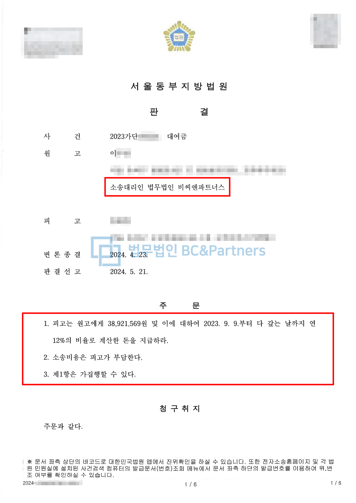 전부승소(4천만 원) [민사]ㅤㅤ<대여금청구> 2024.05.21. 본문 한 줄 포인트 "대여 사실을 부정하는 상대에게서 대여금 전부를 지급하라는 판결을 받은 사안" 사건의 결과 / 관할 / 처분날짜 전부승소(4천만 원) / 서울동부지방법원 / 2024.05.21. 담당변호사 대표변호사 이병찬 변호사 방호근 이전글 다음글 목록