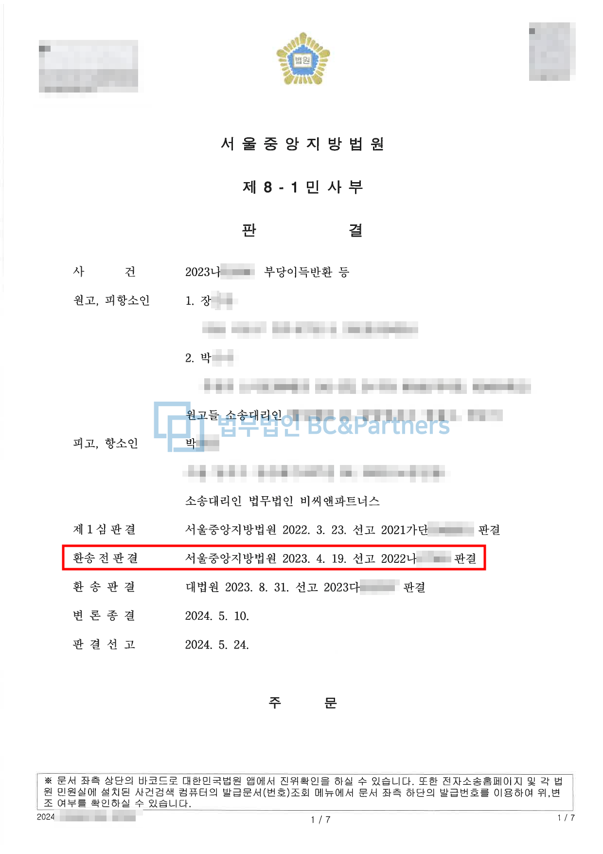 항소심에서 패소 후 대법원에서 파기환송받아 승소 / 서울중앙지방법원 / 2024.05.24.